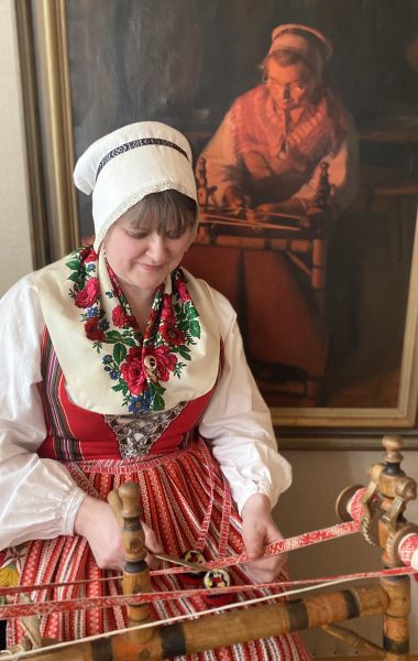 Kirsi – ”Leksandsbandvävstolen är unik i sitt slag. Lokalt i Leksand utvecklades en bandvävstol med trampa och bandgrind i kombination med halvsolv…… Leksandsbandens mönster har dokumenterats och publicerats, men det finns inga tydliga instruktioner för att sätta upp och väva banden. Själv har jag fått söka upp kunniga äldre kvinnor i min by för att lära mig. Medelåldern ligger över 80 år och denna immateriella kunskap är på väg att försvinna. Jag vill dokumentera i ord och bild hur hantverket fortfarande utövas och utforma pedagogiska beskrivningar för att sätta upp och väva Leksandsband med Leksandsbandvävstol.”